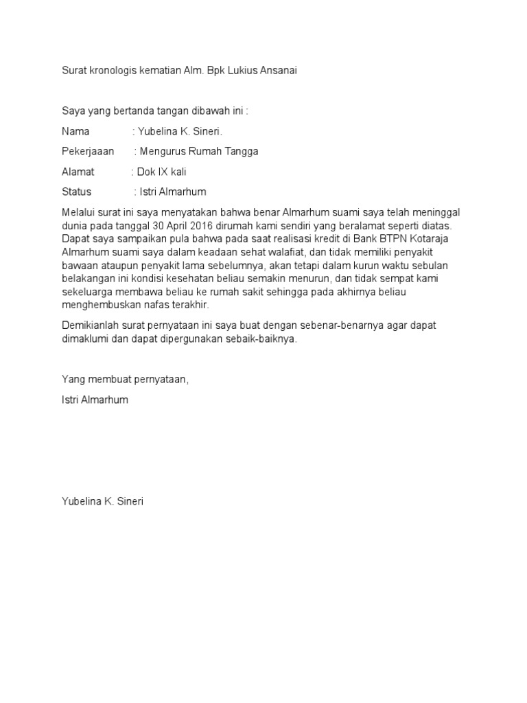 SURAT KRONOLOGI KEMATIAN Sigit Saptono Download Contoh Surat Kematian DOC. Tempat tanggal lahir. Contoh Surat Kronologi Kematian Untuk Klaim Asuransi.